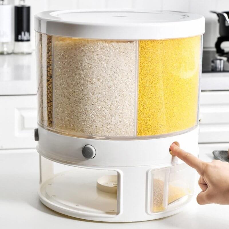 : تصميم دوّار يوفر المساحة ويسهّل الوصول إلى الأرز والحبوب. يمكن تدوير حاوية الأرز بزاوية 360° لتفريغ المحتوى بسهولة دون الحاجة إلى رفعها، مما يجعل إضافة الحبوب وإعادة التعبئة أكثر سهولة وراحة.